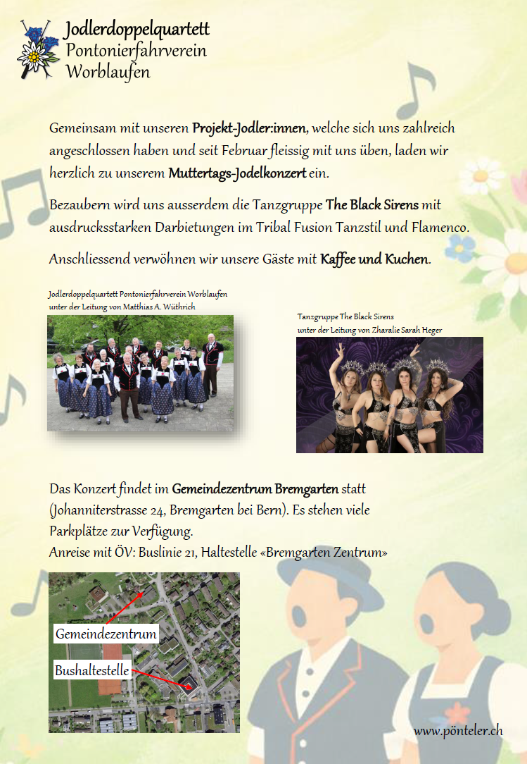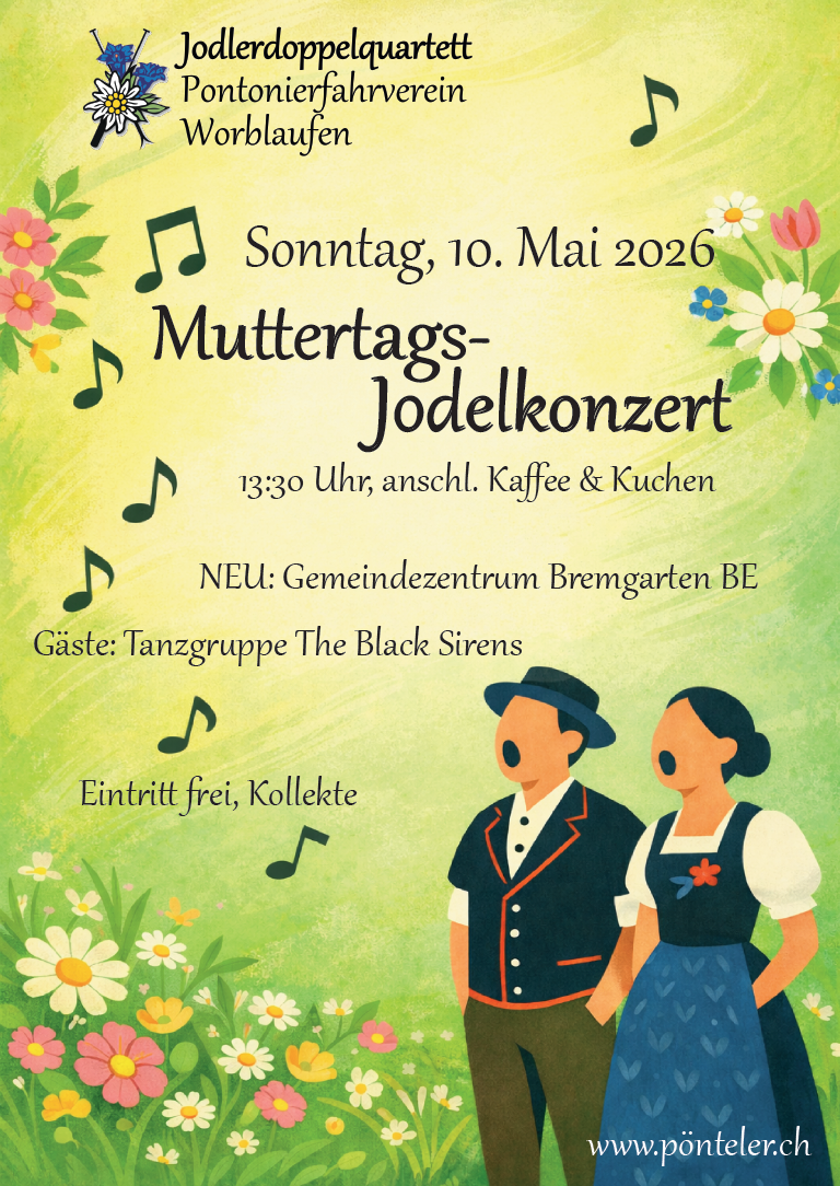 Das Muttertags-Jodelkonzert des Jodlerdoppelquartetts Pontonierfahrverein Worblaufen ist die perfekte Überraschung, um die Mütter auszuführen und anschliessend an das Jodelkonzert mit Kaffee & Kuchen zu verwöhnen.